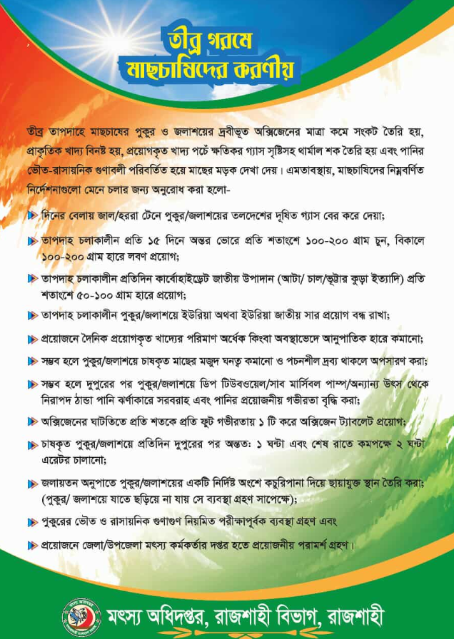 | ১ | তীব্র গরমে মাছচাষীদের করণীয় সংক্রান্ত লিফলেট সংযুক্ত করা হলো। সম্মানিত মাছচাষিদের প্রয়োজনীয় পরামর্শগুলো অনুসরণ করার অনুরোধ করা হলো | | ১২-০৪-২০২৬ | দেখুন | |